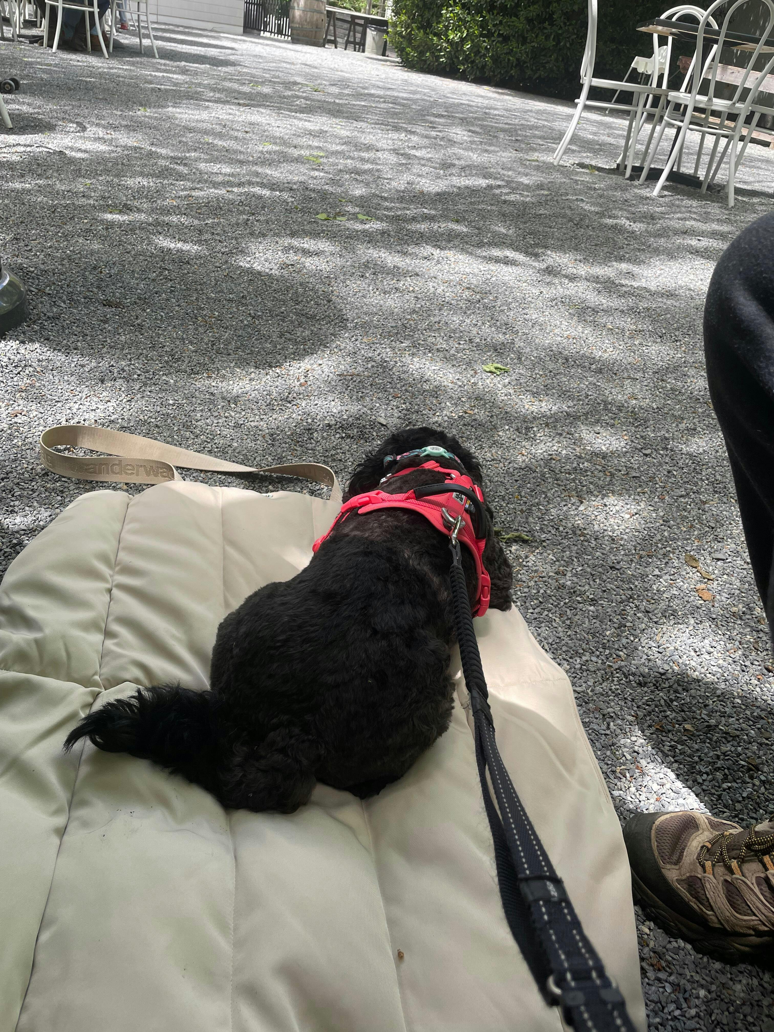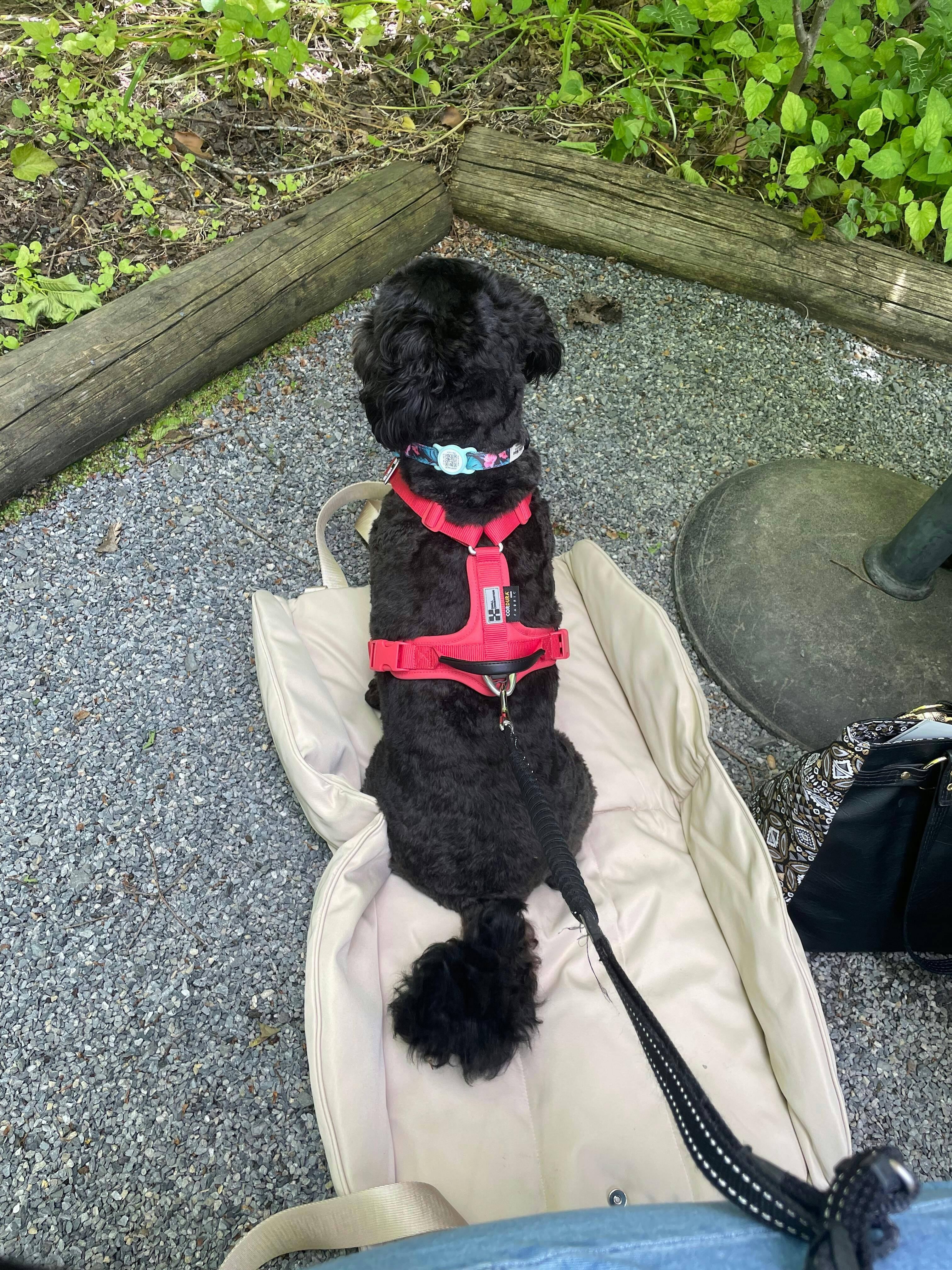 small dog laying on wanderwag tote bed next to bushes and a curb