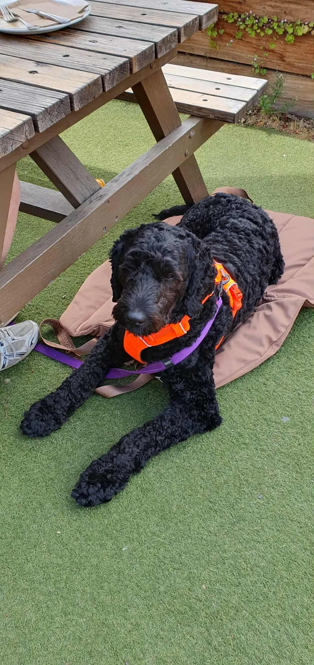 women on a park bench leaning over to pet dog laying on the wanderwag tote bed